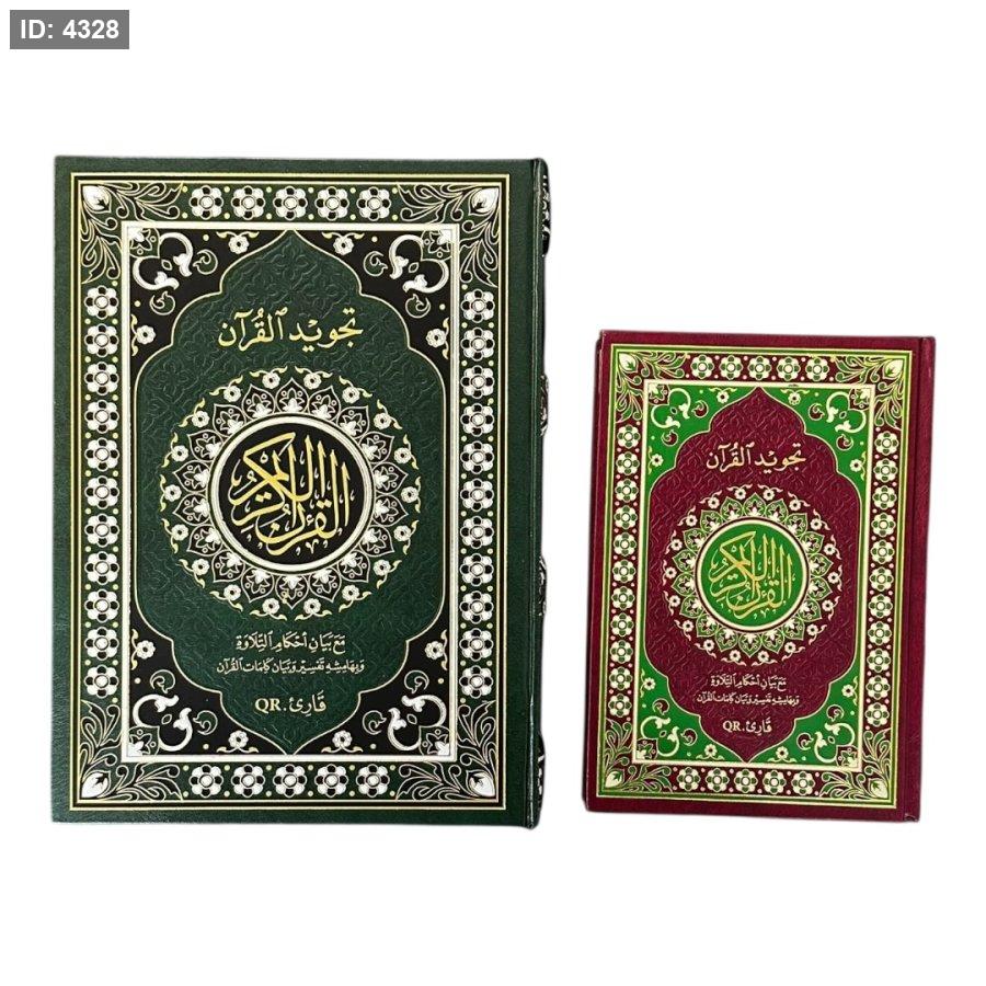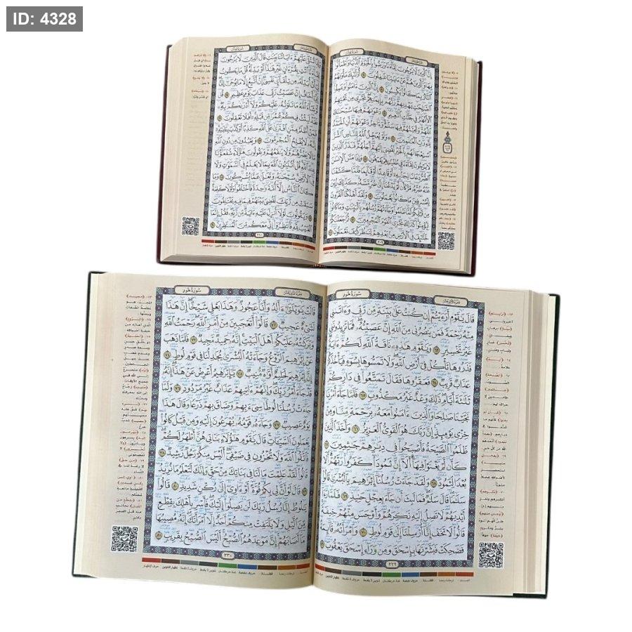 مصحف تعليمي ملوَّن يُعنى بتطبيق أحكام التجويد أثناء التلاوة، حيث تم تمييز الأحكام بالألوان لتسهيل معرفة مواضع المدود والغنة والإدغام والإخفاء وغيرها من القواعد. يتضمن شروحات جانبية مختصرة لبعض الكلمات وأحكامها، مع رمز QR يتيح الاستماع إلى تلاوة نموذجية تساعد القارئ على تصحيح النطق وتحسين الأداء. مناسب للتعليم الذاتي ولطلبة حلقات التحفيظ.